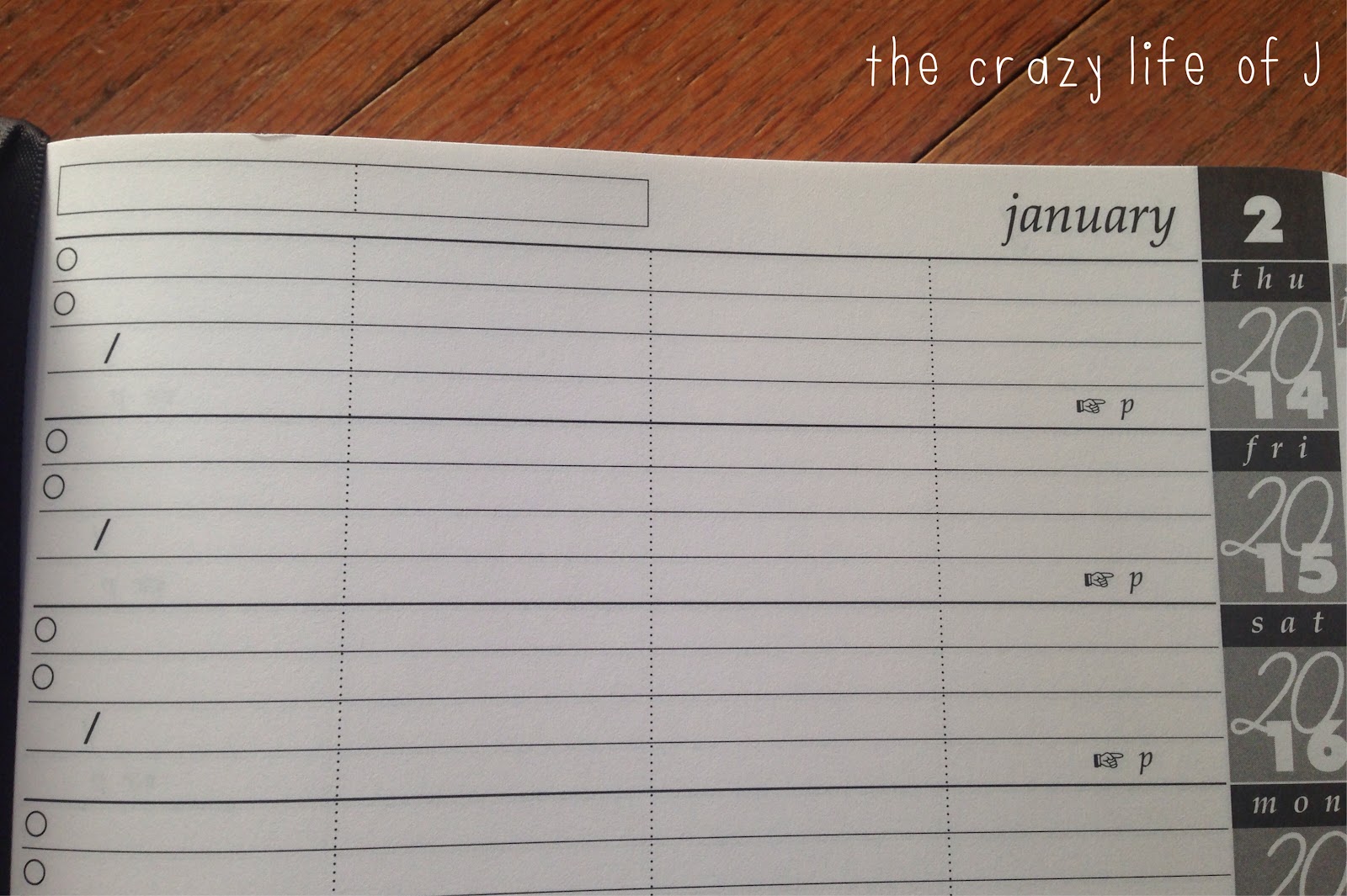 The pages also have a few additional features, including two boxes at the top where the company suggests noting special re-occurring events on that date. Each day also has two circles and a slash, where you could record anything from the weather to blood pressure readings.